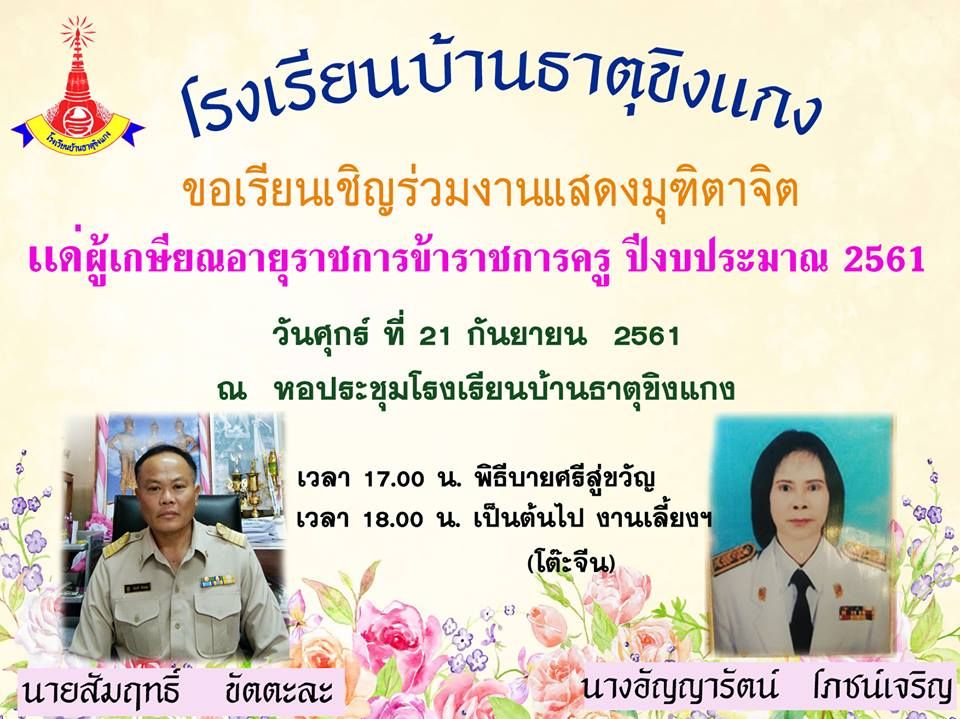 โรงเรียนบ้านธาตุขิงแกง ขอเชิญร่วมแสดงมุทิตาจิตผู้เกษียณอายุราชการ ประจำปี 2561