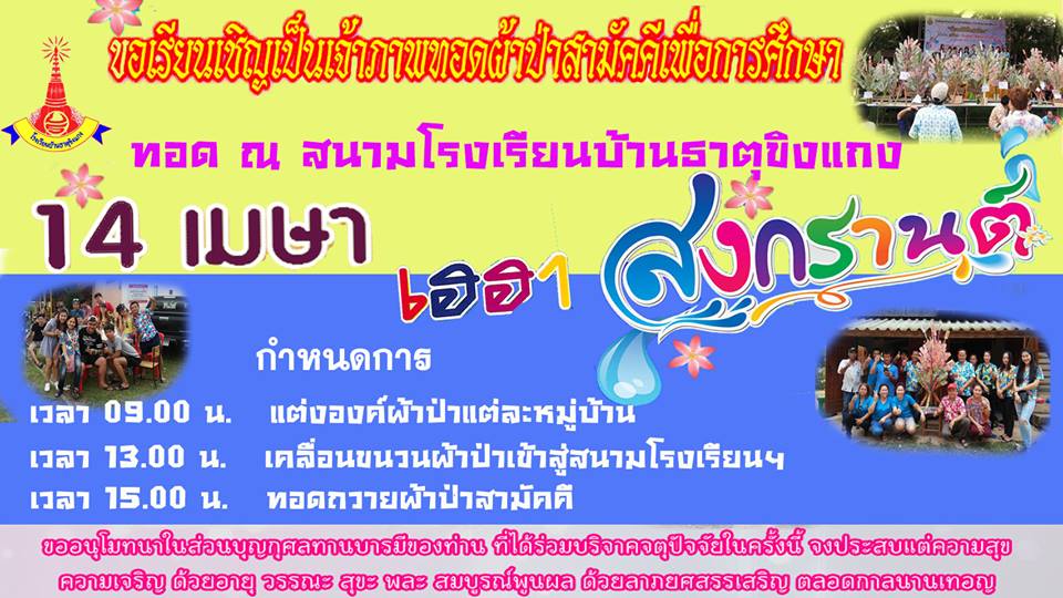 ขอเชิญร่วมเป็นเจ้าภาพ ผ้าป่าศิษย์เก่าเพื่อการศึกษา ในวันอาทิตย์ ที่ 14 เมษายน 2562 ณ สนามโรงเรียนบ้านธาตุขิงแกง
